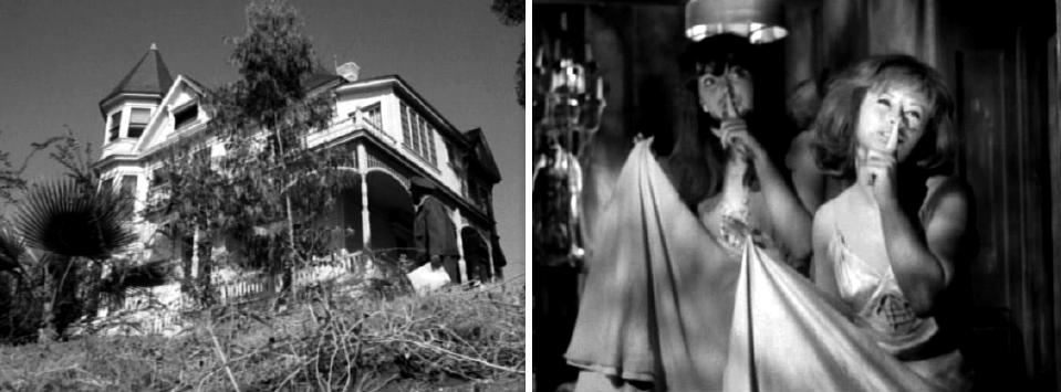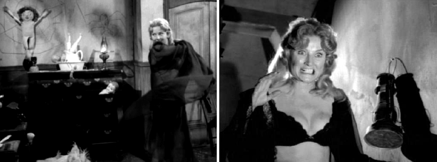 Seventeen-year-old Jill Banner is creepily sexy – which is legal in some states – in her role as Virginia the Spider Baby. Harsh and thrashing when excited, soft and graceful while stalking, she does a believable spider imitation. In contrast, Beverly Washburn, an experienced stage actress and a former child star, tends to overplay her role as the younger sister. It works well though, because these contrasting performances represent the varying degenerative mental states of Merrye Syndrome. Carol Ohmart, who you might remember from House On Haunted Hill (1959), was a fifties starlet who caught on like the flu – gone in a week. She plays the tough, greedy cousin who strip-dances in front of a mirror, and is later dragged into the bushes by Ralph. Her confused demeanour thereafter is obviously a testament to the joys of pre-human sex.