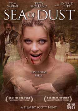 “Sea of Dust” is filled with plenty of blood and gore, as heads explode in their last stage of being under the compromising spell of Prester. Prester John is played by horror legend Tom Savini, and his eerie costume is accentuated with blackout contacts as he bewitches the villagers with his murderous ideals. The historical costumes fit the time period in which the film was based, which is hinted at but never truly declared. There was one scene in which Stefan was underwater, which was cheesy in that he wasn’t even wet and floating amongst CGI generated aqua blue coloring and white circles.