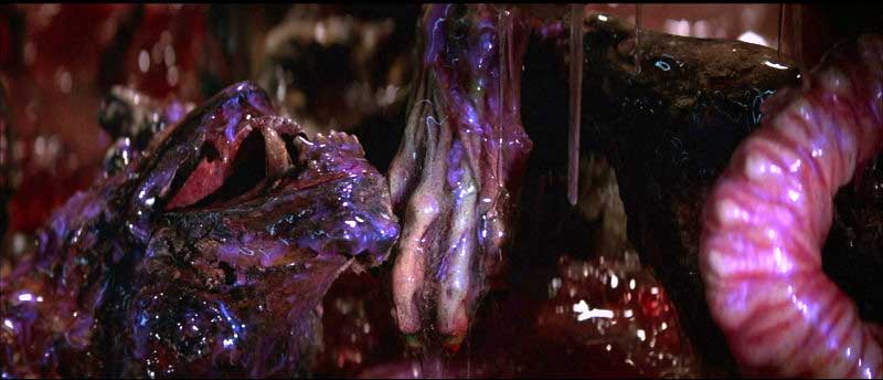 The film is an abject lesson in building tension and atmosphere economically. It opens with a beautifully photographed scene of a husky fleeing across the snow, being pursued by a Norwegian helicopter trying to shoot it. It makes its way to an American research base. Why are the Norwegians trying to kill the nice doggie? We are instantly hooked. Building slowly, but giving extraordinary value when it reaches its climaxes, the film goes on from this mysterious opening to detail the slow growth of the horror of loss of personality, and of alienation from those close to you. It is a recognised nightmare of small children that a friend or parent appears alien, distant, a thing without a face. The ‘thing’ begins taking everybody over, and there seems to be no way of knowing who is real and who is a monstrous replica built out of the ‘thing’s protoplasmic ability to look like anything at all, and its undoubted intelligence.