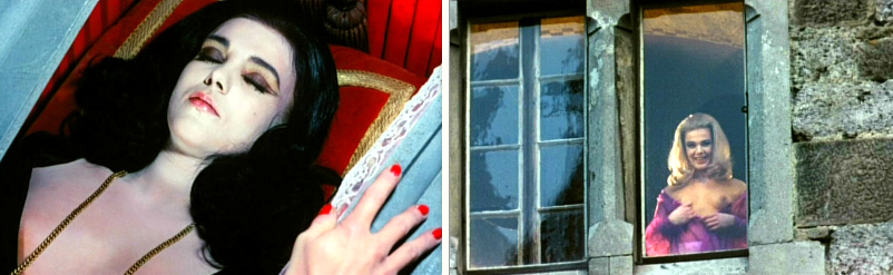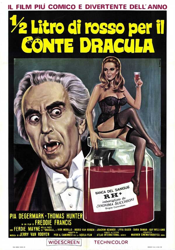 This rather bawdy tale was conceived (possibly while drunk) by Italian producer Pier Caminneci, who cast his own beautiful wife Pia Degermark – twice. Pia plays the beautiful American Betty Williams, who travels to her ancestral home in middle Europe and resurrects her vampire ancestor, also played by Pia. This is a cue for the expected mistaken identity scenes, leading up to both of them attending the annual exsanguinators convention, with the guest of honour being Count Dracula himself. Pia doesn’t do too badly with her dual-role and when she finally meets herself, it’s strangely touching. Hmm, that didn’t sound quite right…