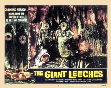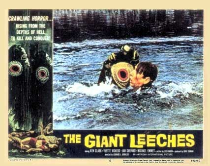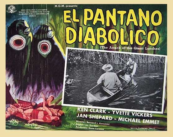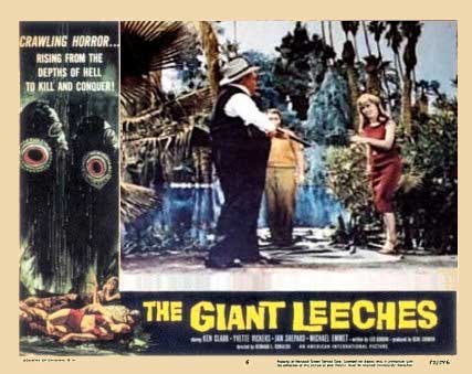 “After local moonshine-swilling trapper Lem Sawyer sees a giant creature, people start disappearing. While searching for illegal traps Steve Benton and Nan Greyson, his girl-friend find Lem dying with giant sucker wounds on his body. One couple Liz Walker and Cal Moulton, forced into the water by her enraged husband Dave Walker, gets taken by the leeches. When police refuse to believe Dave’s story, he hangs himself. Soon after this, two more trappers disappear, the local Game Warden Steve Benton gets involved. He and Nan’s father Doctor Greyson realize that the people were taken by the leeches and the leeches live in caves under the swamp. Using dynamite, the four missing bodies are discovered and the leeches are destroyed.” (courtesy IMDB)