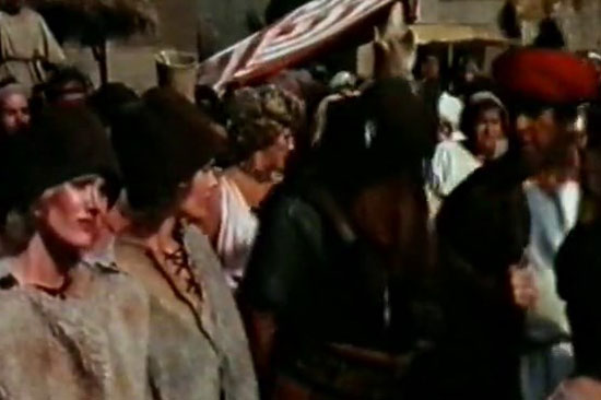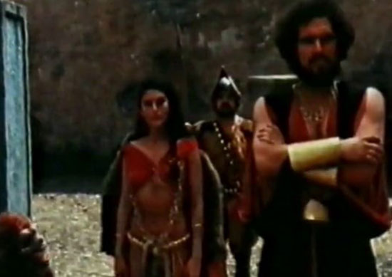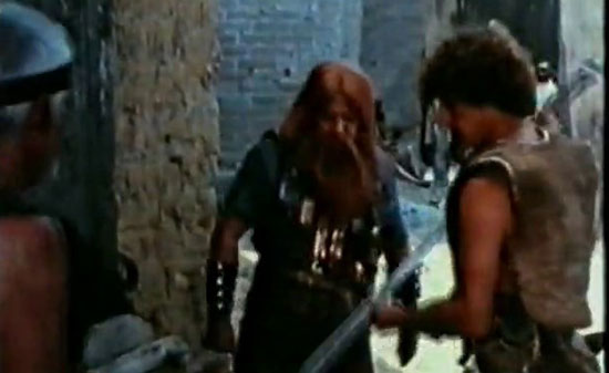 The film takes place in ancient times and starts with the evil sorceror who wants to sacrifice his firstborn child to his god, Caligara. (I swear that it sounds like he’s saying Calgon). He tracks down his wife, who has yet to give birth, but his plans are thwarted when he is defeated by the warrior Krona. Traigon’s wife dies after giving birth to twin daughters, and Krona swears that he will raise them to be great warriors and magic users.