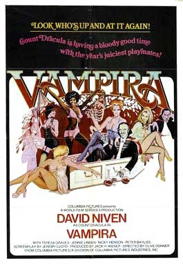 From Abbott And Costello Meet Frankenstein (1948) to Old Dracula (aka Vampira 1976), every traditional aspect of the genre has been picked over and poked fun at. Played by David Niven, Old Dracula is a vampire who, because of advanced age, is forced to host tours of his castle to get new victims. In an attempt to revive his long-lost love Vampira, Dracula sets out to collect blood from the bevy of Playboy Playmates living at his castle.