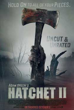 Actually I think I’m in a cheery mood because I just came in from watching Adam Green’s “Hatchet 2” & althought the movie was no great shakes (more on that in a second) I was the only one in the theatre! HOO BOY!! I love being alone in a bijou watching a movie. It’s like having your own 200 seat screening room with a booming sound system. Of course I was probably the only one there because nobody has heard about this movie more than likely or maybe they’ll be around tonight. But since the movie is getting a token unrated release before it’s DVD/VOD debut shortly it’s probably easier for those who want to see it to just wait. But I have to wonder: Why release any film unrated nowadays? Even if it’s only for a week or so? I mean no one is going to accept advertising for an unrated movie nowadays, no radio spots, commercials or newspaper ads for unrated movies nowadays.