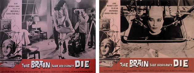 I’m digressing already. This week’s feature is the 1962 celluloid crime against good taste, The Brain That Wouldn’t Die (1962). Actually it was made in 1959 but common sense prevailed for the next three years. The story-line concerns a Mad Scientist, one of thousands in the history of world cinema. Nowadays Mad Scientists make it easy for us to spot them by helpfully identifying themselves as Creationists. But this week’s madman of science is doing the wrong type of creating. You guessed it! He’s trying to play God, so it can hardly be called a spoiler when I tell you he’s going to be punished for his presumption. This movie has the same message as the Tower Of Babel: Stay in your place or God will smack you hard!