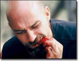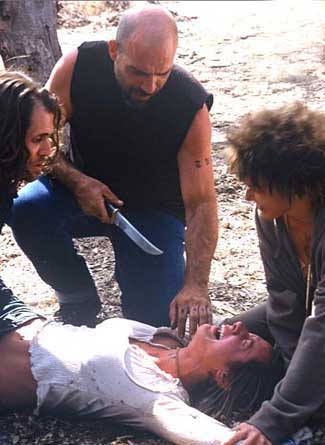 Angelica has just come in from college to visit her long time friend, Emily. Her mother (of an interacial marriage) is worried about the two hanging out together in the first place… Just as Mari’s mother was with Phyllis. Instead of a Bloodlust concert (which sounds much more appealing), these two girls go to a rave in the middle of the woods. There, they decide to score some drugs. Instead of sticking with the reefer, such as Mari and Phyllis, Emily and Angelica go for the “E.” Their dealer in shining armor…or a black t-shirt, is mistakingly approached by the attractive, young dope fiends. His name is Swan…”Yeah, baby…Like the bird.” Swan is the “Junior” of the sadistic clan, played by Sage Stallone (That’s right… “Sly” Sylvester’s son and owner of Grindhouse releases). He tells them he can find some, but they have to follow him back to where his “band” is recording an album. They follow him and meet the rest of his friends (and father) who turn out to be the two lost girls’ worst living nightmare…