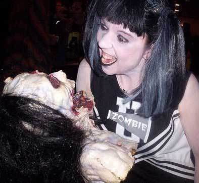 I think my most favorite Zombie Cheerleader moment occurred at Ghastlee’s Scary Camp back in 2004 in Dayton, Oh. I was helping Ghastlee with his convention and it was the first major appearance of the Zombie Cheerleader. I was standing to one side of the convention on a Sunday morning when I caught the sounds of a school graduation in the distance. The convention center in Dayton was large and there were a couple of events going on along with Scary Camp. Another guest, and good friend, Grim, from the Patient Creature,s also heard the graduation ceremony. We found out there was a Catholic private school commencement being held and it was coming to an end. We figured we would stand by and watch. Little did we know, the graduation class, families and all, had to pass through our convention to get out of the building. It was magic. Grim stood there, scythe and all, glaring blankly above the crowds as they passed us. I stood there waving my pom-poms and smiled as the procession passed. As the graduating student’s parents passed, they either looked away in horror, looked at us in horror and then looked away, or just looked horrified. It was the greatest collection of whimpering, sour-pussed face adults that I have ever seen. How miserable it must be to have no sense of fun and no sense of adventure. Most of the graduating students, however, did not appear to be bothered by our presence.