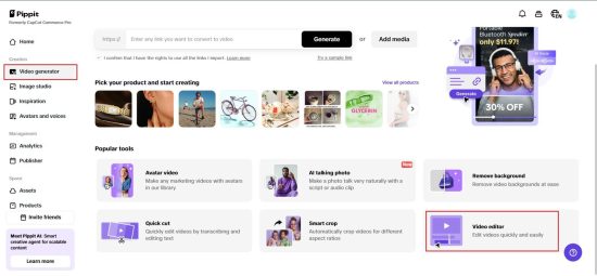 Begin by registering on Pippit and opening the dashboard. From the left-hand menu, choose “Video generator,” followed by “Video editor.” Upload your video by hitting “Click to upload” or simply drag and drop it directly into the editing environment. Pippit greets you with an easy-to-use workspace that is optimized for speedy action.