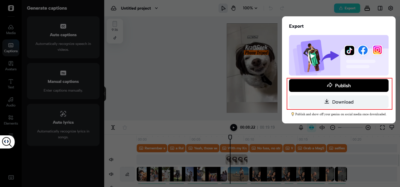 When you are done with your edits, click the “Export” button at the top right of the page. There, you can tailor settings including resolution, file type, frame rate, and quality before saving your video. If you wish to publish your work right away, click “Publish” to upload it directly to connected social media accounts without further trouble.