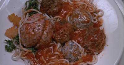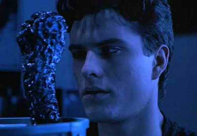 Soon afterwards, Brian begins to become more & more distant. And far more dependent on the blue juice that his little buddy supplies him with. He exults to Barbara as to what he sees now but it won’t let him explain the situation to anybody. This particular scene takes place at a restaurant where Brian’s plate of Spaghetti & Meatballs turns into a plate of Spaghetti & pulsating brains in a nifty & nasty looking effect. He leaves Barbara at the restaurant as he roams the streets with his buddy looking for a new victim. He finds an alley and after a shot of the blue goo he’s feeling a lot better. He hears music coming from a club called “Hell” across the street. He enters & immediately enters and just starts dancing & hugging the speakers. He catches the eye of a young girl at the bar & immediately starts to dance with her. She tells him “You’re high aren’t you?” but enjoys the attention he’s giving her & she takes him down to the boiler room underneath the club where after some heavy petting & kissing she grabs his crotch & recites the film’s funniest line: “Feels like you got a monster in there”. She unzips his zipper & out pops his brain eating buddy into her mouth. This scene was actually cut out of the “R” rated release because of the obvious oral sex correlation. It does look like she’s throating a large misshapen penis when in actuality it’s eating her brain.