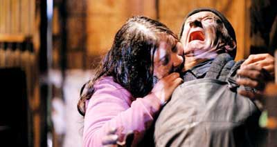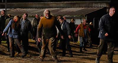 Romero has created a pretty well thought out story with this addition to the legacy. We get alot of compassion, character build and human emotion that blends nicely with pretty hard core gore. In fact, this film probably features some of the coolest head exploding, shot in he face… and zombie kills I’ve seen on screen in quite some time. My favorite is the fire-extinguisher-in-the-mouth-till-their-eyes-explode segment. There is also a heavy does of dark humor in segments as common folks become inventive with zombie warfare. One example is a small group of hunters who place a handful of still functioning zombie heads on poles for amusement. Again this is a great example of the special FX work with really shines in this film that is handled mostly by the SPIN FX group. Some of the head explosions are pretty in your face relying on CGI than say the old school way of doing it like you might find in old films like “Scanners” Though I am anticipating the horror crowd to still be on either side of the fence with this…… some folks don’t like CGI whether its bad or good…period.