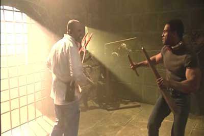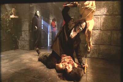 And it isn’t….. by any ones standards. The line was called “Fangoria Films” in which this and a forgotten handful of others were starting to show up on various rental shelves. With 3 cool looking villains on the front, it seemed to be enough to indulge a viewer to rent. Though I think what was expected and what was delivered were 2 different things. In the same vein as the reality fight-to-death-Arnold film “Running Man”, Slashers comes of a more of a cheap knock off. In fact it looks like the set was just a converted paintball warehouse. Though as a viewer I love to see a challenge, a game and some cool monster faces who despite being quirky, you tend to root for in a sinister way. The characters are what works for this film and are actually quite unique as far as villain bad boys go. The name of the game is camp, which is greatly supported by a flock of dancers, cheesy announcements and some amateur TV style filming.
