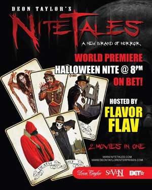 Anyway’s the story picks up as the tension is raised. Mary gets forgotten about as the teens foolishly let in a water soaked clown to use the phone. Another pretty easy plot set up – not to do. This is also followed by a water soaked policeman who is let in shortly after. So we have a house full of folks wanting to use the phone and in the background teens are getting murdered mysteriously. A pretty rampant session of finger pointing carries on and misdirection is used to change the plot narrative. Not a bad short film and done effectively. The quality and professional appeal in both shorts overall was pretty entertaining. That is until Flavor flav pops back up on screen to tell his audience to buy the film (which should have been assumed they did anyway’s) and of course uses even his host appearance to self promote his name a bit more. Ok, I get it…. the name additional might help sell a few more copies to interested viewers. Though the real strength here is in the story telling and not the cameos. I think Nite Tales has a chance to win a few hearts and continue on their path. Though I’d screen your stories carefully so that the series (which we assume they’ll be branding) will continue to offer great entertaining stories.
