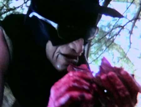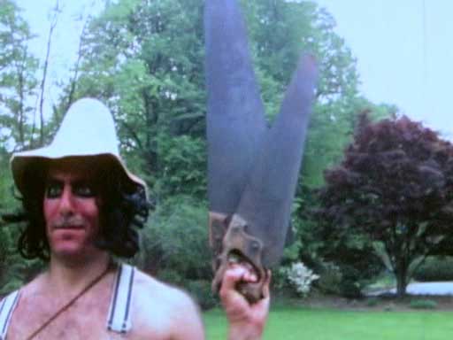 In any case, Don’t Cut the Grass Anymore is shot in old gore mode with on hand props and some quick gore gags that are easily revealed in some of the shots. For instance the film begins on a couple who are enjoying the day making out on their lawn. Jacob, brother to Billy Buck proceeds to walk over and hack them to death. The scene is pretty straight forward exploitation gore though the gag is somewhat ruined by some obvious props that aren’t too cleverly revealed. A board underneath the couples shirts moves around as he hacks into the fake chest cavity and then finishes the scene off with a lengthy peel the skull of its flesh sequence. For cheap gore its still pretty brutal especially for the time it came out. Jacob sports a rather eerie face which I couldn’t figure out if it was supposed to be a mask or not due to his chin never moving. In fact something about his look reminded me a bit of that Indian mask that they wore in the film “Body Double”