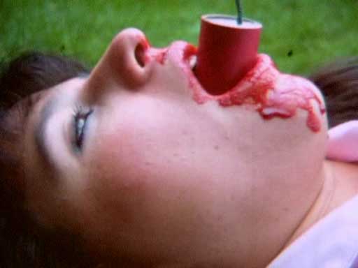 The locals are terrorized as they pretty much do as they please with guns, saws and blades by attacking folks in plain daylight. The target of course is yuppies and for no apparent reason than to slowly rip them apart. When I say slow, I’m being literal and it kind of drags the gags out way too much. Yep, there gory as hell, gross and over the top but the shots are long as if they were playing with the bodies as much as they are disemboweling them. There really isn’t much build up and the victims are killed quickly and disremembered slowly. One shot has then sawing off each of a young girls limbs, and then poking out her face. Another is them lighting a rather large firecracker in ones mouth and blowing her face off. Though as extreme as this sounds I couldn’t hardly stay awake thru most of it. So if you like gore for gore’s sake then have at it. The movie is shot on 16MM and uses drawn cards for credits. The 2 brothers are dumb as all hell and take the role of backwoods mentality pretty literal. I could of stood for more comedy form them to break things up a bit as they are somewhat likeable.