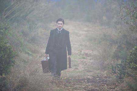 THE WOMAN IN BLACK is the story of a young lawyer named Arthur Kipps (Daniel Radcliffe) who travels to a remote village to organize a recently deceased client’s papers, and discovers the ghost of a scorned woman set on vengeance. The images show a mature looking Radcliffe clad in a drab black suit walking with suitcase in hand through a gothic blanket of heavy fog. The second image is a closer shot of Radcliffe looking alarmed and possibly in peril. THE WOMAN IN BLACK was directed by James Watkins and will hit theaters in 2011.