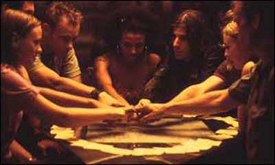One of them, grabs the joint and puts it out in the ashtray on the coffee table in front of them and expresses his desire to go out. Annie (Melanie Gutterridge) then walks in, and they all agree to meet at the club. While at the club, the group discusses they best ways to get a buzz. Their new roommate, Joe (Mel Raido) mentions railroad lines, where you set up a line of cocaine on a railroad track and snort it while trying to beat the oncoming train. Liam claims that he got his best buzz from using an Ouija board, afterward they all agree to try it out. The group ventures into an abandoned part of the club, which looks like an empty warehouse and set up a makeshift Ouija board, made from little square pieces of paper with letters and answers written on them and they use a glass for the centerpiece. After each one of them rest one finger on the glass, Lucy (Marsha Thomason) begins the séance, urging any nearby spirits to join them. No one seems to take her seriously, that is until the glass starts to move franticly across the table. The spirit calls itself, ‘Dijnn.’ Liam loses it and chucks the glass on the floor, shattering it.