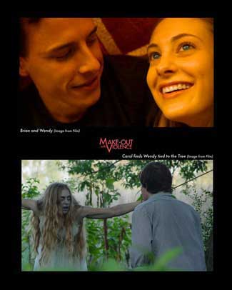 Makeout of with Violence is a unique title. In fact it doesn’t register what “that” refers to till the last act. The story starts on a solemn note as “Beetle” (Brett Miller) the youngest brother of 3, narrates the disappearance of Wendy Hearst (Shellie Marie Shartzer) a local school girl and friend to the family. She made quite an impact on the boys and their friends who was well liked and fun to be around. The older twin brothers are Carol (Cody DeVos) and Patrick (Eric Lehning). They are the focal point the film that follows them through emotions, relationships and there discoveries. The discovery happens to be the body of Wendy who is found in the forest. The quirk here, that separates it from scenarios seen in films like “River’s Edge” is that Wendy is still “somewhat” alive. It’s never made quite entirely clear but she has come back in a form of a haunting zombie state. Her movements are much like a body without control of muscle navigation and her eyes are glazed over from being underwater. The fact is, Wendy is indeed undead. This presents a problem and a fascination as the boys bring her back to clean her up and take care of. Patrick, takes the lead and nurtures her over the summer in some hope of regaining the former version she embellished before her undead state.