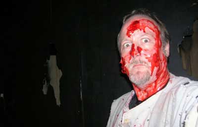 A last minute wild ride through many miles and construction made us late for the opening film,”Let the Right One In”, which played to a sell out crowd. We collected our press passes from the very nice volunteers at the Bloor Cinema and headed to the Annex Wreck Room to mingle with the other guests who appeared to be mostly bloggers and fans. Big Screens played horror trailers from mostly the 60’s while music from my misbegotten youth filled the club. After too many drinks from the lovely ladies who work the bar, there appeared a man on stage that was quickly duct taped to a chair. The act from the performance group “Circus of the Damned.”