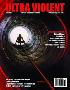 I was recently given the pleasure to review some mags by the name of “Ultra Violent”, a name I was familiar with though quite frankly was hard to come by in my neck of the woods. So it’s fair to say that #10 was actually my first issue of there’s to read and review. Right off the bat, I have to give kudus to an enormous accomplishment for a magazine. Over 100 pages easily falls into the category of a small book, though its marketed of course as a magazine. And unlike “other” mags of the genre, its longer, has an impressive amount of writing within and easily outweighs in sheer amount of content over advertising. That of course is just getting started.