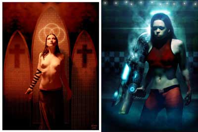 The images themselves go mostly unnamed until the chapter summaries. However, the chapters are split into illustration categories. So what we have are sections of Character Design, CD art, DVD art, illustration and photography. Now the work itself being highly photoshop composed is highlighted with the strength of a variety of interesting models. These photographs are composited into watercolor, textures and modified photographic backgrounds. A personal highlight for me was seeing the collection of “DVD collection art” produced for various box sets. A few I recognize, a few I own and and I’m guessin that there were many here that may have not gotten released for whatever reasons. Probably due to economic downturns in the horror collections pack sales……. but none the less the art is fun and intriguing and nice to see under one roof.