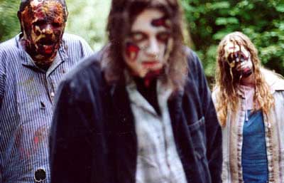 The zombie makeup is cheesy – sometimes poorly done grey-tones face makeup, other times caked-on zombie abrasions. Horrible. Most of the zombie staples are in place: the zombie bite closeup, the shot to the head and the zombie gut-munching frenzy. The later effect, when the zombies are pulling the innards from a recent victim is visually inferior but still gruesome; however, the very same effect is used again later in the film reducing any effectiveness it may have achieved. Regardless of the shock effects littered throughout, a zombie picture is dependent on the zombie make up but those found in Dead Eyes Open are mediocre at best and at times outright ridiculous.