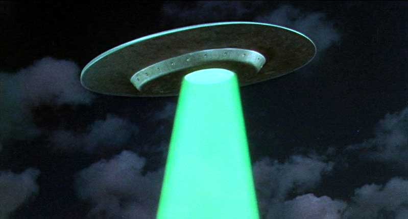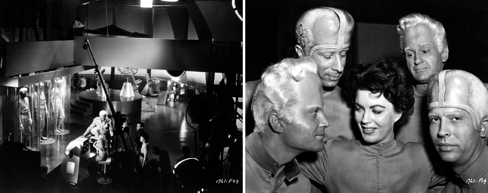 These sequences showing the huge flying saucer arriving at the ravaged planet, and the subsequent scenes of alien ships bombing the planet’s surface with giant meteors, are the most spectacular in the film. A psychedelic light-show impressive for its spectacular artificiality, created by a combination of model work, matte paintings and super-imposing, all the work of special effects artist Stanley Horsley and master cinematographer Clifford Stine.