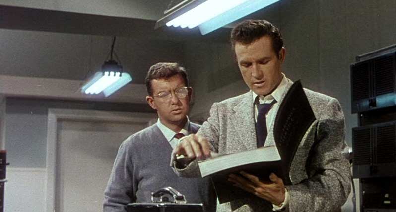 Meacham is introduced to Doctor Carlson, played by the most familiar face in the cast, Russell Johnson. His early roles were primarily in Westerns and genre films such as It Came From Outer Space (1953), Attack Of The Crab Monsters (1956) and The Space Children (1956). He appeared in two episodes of The Twilight Zone: In Back There he tries to prevent the assassination of Abraham Lincoln, and in Execution as a college professor. Johnson also appeared as a major on a US space station in The Outer Limits episode Specimen Unknown, but he’s really best known for playing Professor Roy Hinkley, the erudite polymath who could build all sorts of inventions out of the most rudimentary materials available on Gilligan’s Island but, as Johnson himself once told me, “He still couldn’t fix the hole in the goddamn boat!” But I digress.