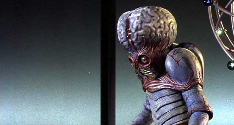 Meacham also meets the man who brought him there, Exeter (Jeff Morrow) and his assistant Brack (Lance Fuller). Meacham, being a highly trained scientific observer, notices that Brack has the same high forehead and white hair as Exeter, and cleverly reasons that “There’s something strange about those two.” After a lengthy build-up, he and Doctor Adams find themselves on board a huge spaceship bound for the planet Metaluna, a world involved in the final stages of interplanetary war. Metaluna is nearing total defeat and in danger of being completely destroyed unless its defensive force-field can be maintained. Exeter and Brack had been sent to Earth to recruit fresh scientific talent, but by the time Meacham and Adams are brought to the planet it is already too late.