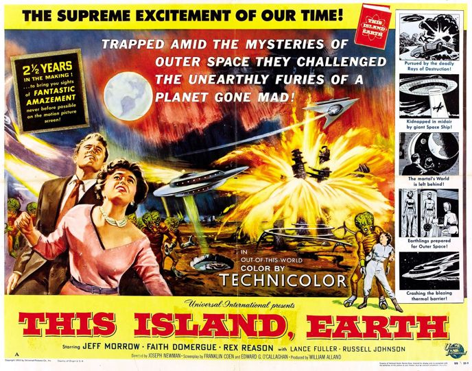 Midway through the fifties it seemed as if the Hollywood science fiction film was about develop in an interesting new way with two new films: This Island Earth (1955) and Forbidden Planet (1956). Both contained all the ingredients of the magazine Space Opera (intergalactic adventures, dead or dying alien civilisations, vast incredible machines, super-science, etc.), a genre that had been popular with readers since the thirties but until then hadn’t really been transferred to the screen. However, because of the need for plenty of special effects and elaborate sets, both films were extremely expensive to produce and, although they proved financially successful, they weren’t profitable enough to persuade other film companies to invest large amounts of money into similar films. So this development came to an end before it properly got started, and didn’t surface again until the seventies.