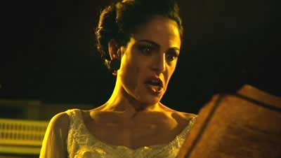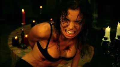 The cast of heroes suffers the worse. Jeremy London, most famous for his supporting role in Party of Five (1995 – 2000) or perhaps his recent stint on Celebrity Rehab with Dr. Drew, stars as the protagonist Russell Bayne and he is dreadful – never good enough to bring any weight or sympathy to the character and never cheesy enough to bring any fun to the role. There’s a scene where he’s walking down the street feeling the effects of lycanthropy for the first time, hearing sounds and sensing smells from a distance. He stumbles across a crosswalk with his hands to his head and a blank stare on his mug – that’s pretty much how he wanders through the entire picture. Christy Romano costars as Alex Layton a more experienced werewolf who tutors Russell to the ways of the wolf. She fares better than London, but that’s not saying much. At least she shows some range. Rhett Giles rounds out the main goods guys in Wolvesbayne as Jacob Van Helsing and plays it all action hero. While a bit one-note and wooden, the performance serves the role.