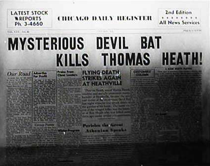 Tommy Heath sure spends a lot of time yelling when the Devil Bat attacks him and fails to kill him in the first swoop. I wonder why he just didn’t step into the house instead of standing there for fifteen more seconds allowing a second, fatal attack. After Tommy’s death, we get to see a long sequence of newspaper headlines announcing the “Mysterious Devil Bat Killed Tommy Heath”. When I say long, I mean it. Was life so boring in 1940 that his death made the headlines of several newspapers? I seem to remember a bit of fuss in Europe about a short fellow with a small moustache, for instance. And some of the newspapers we see are just plain wrong. In one it says reporter HENRY Layton, but as we all know, Layton’s first name is Johnny. Admittedly his name is corrected in the next article, but it’s still a blooper, so I’m going to point it out.