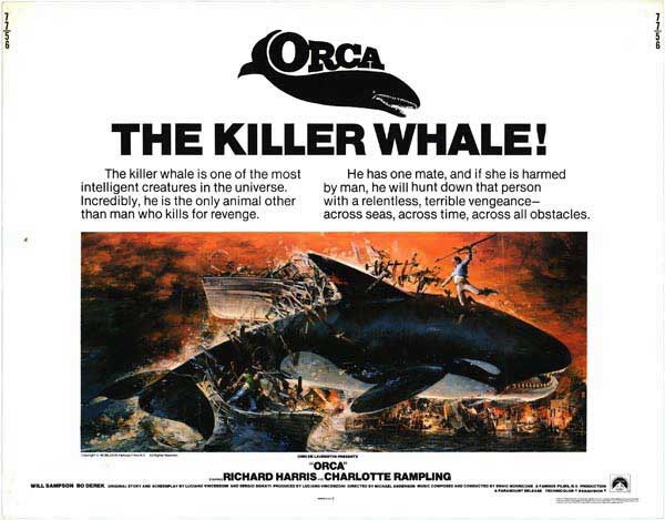 Orca, too, had sadly flat direction and a rather lame story about the revenge of a whale whose mate and child have been slaughtered by Richard Harris (the one notable scene shows the birth of a baby whale at the moment its mother is being hauled out of the water). It bites Bo Derek’s legs off, burns down a seaport and causes a mystical Eskimo to revise his values rapidly in the direction of suburban conservatism.
