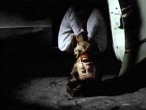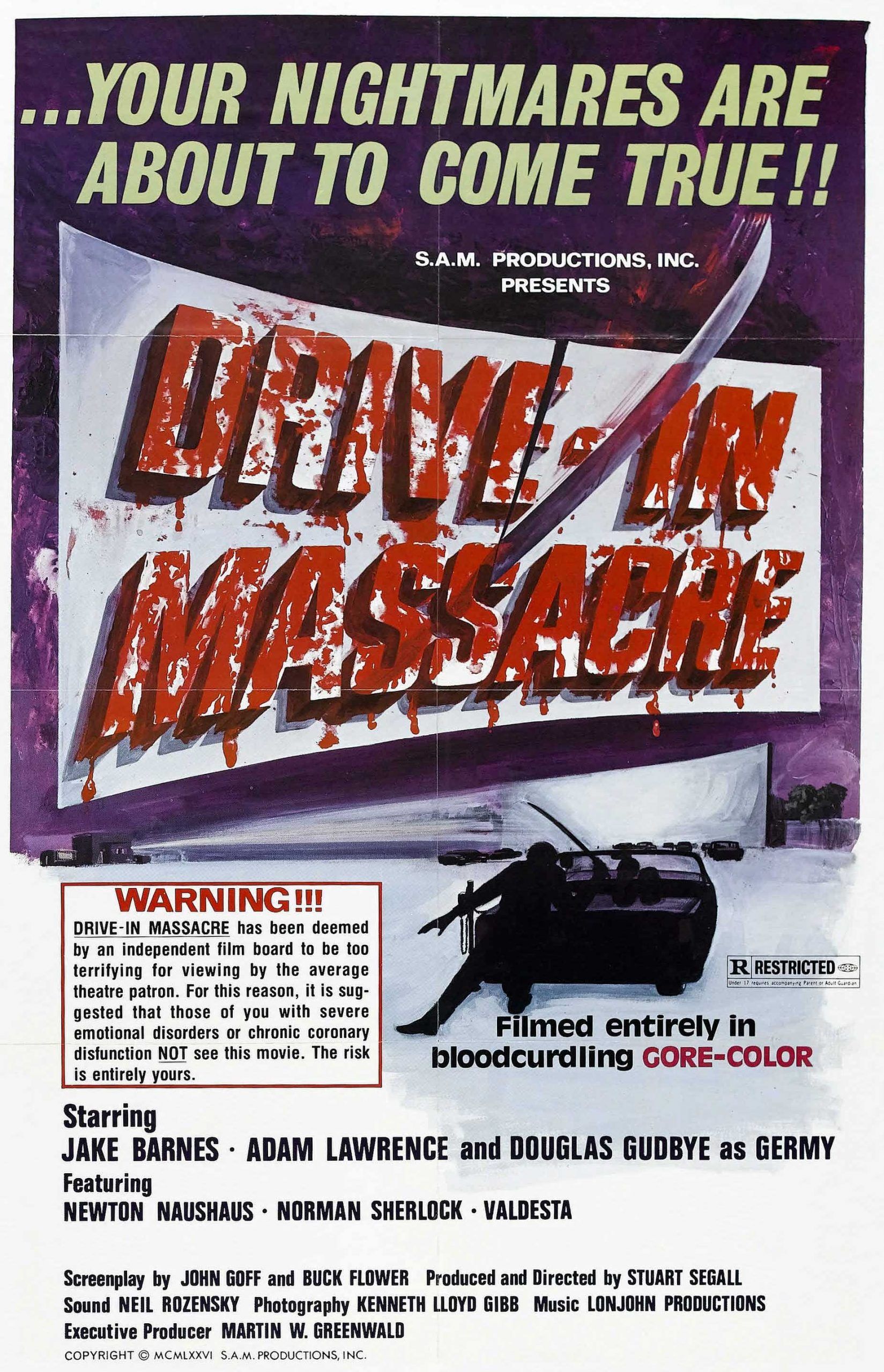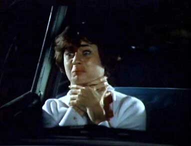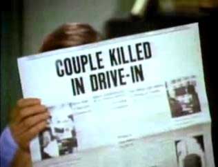 “At a rural, run-down drive in theater, a young couple arrives to watch the movie playing. They park their car and talk about having a baby. The woman suggests procreating at the drive-in, but the man, Alan, wants to see the beginning of the movie. As he reaches out for the speaker to hang upon the car window, he is beheaded by a sword-like machete. The woman screams, but the unseen killer shoves the blade through her neck and she dies a slow death as she opens the car door and falls out onto the ground.” (courtesy IMDB)