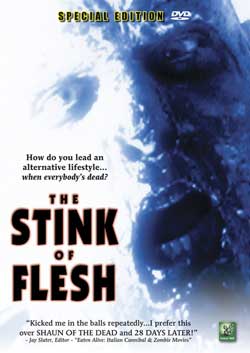 Hell-o, gore mongers of the cinematic wasteland. Today’s review is for a three layered zombie pizza called The Stink of Flesh. Why do I use a decorative dough pie to describe this film? I’ll just start out by honestly and brutally saying… The acting is Mozzarella. The plot is Fennel. The music is Cheddar and the over-all outcome of this micro budgeted zombie/ sex flick is pure cheese. So much cheese, that it hurt my stomach just trying to digest the whole thing in one viewing. The only redeeming factor in the zombie atrocity is some of the “Horror-ish” score.. I for one, am not a zombie fan as I was when I was a kid. I loved them back then.