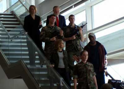Meanwhile two hundred and fifty miles away in Washington D.C. there is some kind of earthquake awareness convention going on (how conveniant). A young woman, Dr. Amy Lane is doing a speech about how in the future we as the people will be able to predict when a large earthquake is going to hit. It really is too bad that Dr. Lane doesn’t have that technology at that moment however cause right in the middle of her speech the earthquake hits; yes it’s the same earthquake. Viewers get treated to various scenes of people running around outside, and some of them do actually look scared. This scene pretty much sets up all of the scenes of the cities being destroyed. The city dwellers that are walking on the streets just really don’t look like they had much direction in what they are supposed to do at all. The viewer is however treated to an actually decent shot of the Washington monument crashing down. Okay earlier in this review I may have been hard on the effects for the SyFy channel’s films and I will say that Megafaults FX are a little better than what I am used to seeing, but that isn’t saying much.