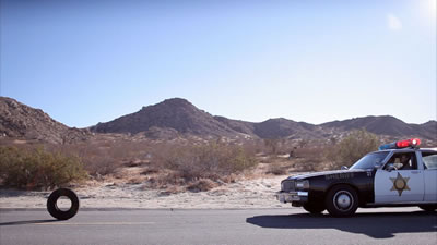 Rubber benefits from having an outrageously original opening that immediately sets the tone for the movie and shatters the fourth wall. When Lieutenant Chad steps out of his patrol car to address a gathering of movies goers and proceeds to give an inspired monologue about the events in movies happening for “no reason,” the result is at once baffling and hilarious setting up for the introduction of the Robert the tire and his antagonistic adventures. Suddenly, the idea of a tire “waking up” and strolling merrily down the road on its own is perfectly reasonable and the audience is primed to witness whatever the writer-director dreams up. Dupieux masterfully weaves together the narrative, the forces driving the narrative, the onscreen audience thrust into the narrative and the audience watching Rubber safely in their theater seats. When it works, Rubber is a real treat to witness…and be a part of. It’s funny, amazing, crazy, simple and complex all at once.