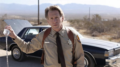 Largely consisting of unknown, but at imes recognizable, character actors, Rubber contains some equally inspired performances. Stephen Spinella, as Lieutenant Chad, leads the cast and provides the all-important speech with passion and conviction. His role, his presence, is the heartbeat of the story; he may not always be on screen, but his character’s impact is always felt. Equally important and equally impressive is Jack Plotnick as the accountant. His character, sometimes more so than Lieutenant Chad, is the strand of reason that binds the imaginary fourth wall back to the onscreen world. Roxanne Mesquida plays Sheila, the mysterious brunette to whom Robert is drawn so passionately. While, at first, she’s mostly there to “be pretty” and to attract the rubber rim of death, she is alter given a scene where she provides the voice to a dummy set to lure Robert out into the open; here she displays a delightful sense of comedic timing helped immensely by sounding off co-star Stephen Spinella. Then there’s Wing Hauser, who manages to upstage all the rest (except maybe Robert) and steal the show. He’s wonderfully funny, in control and four steps ahead of everyone: at least until he mistakenly comes face to face with Robert. The success of the film hinges on how successfully these actors brings the concepts and nonsensical dialog to the screen and everyone delivers. Bravo.