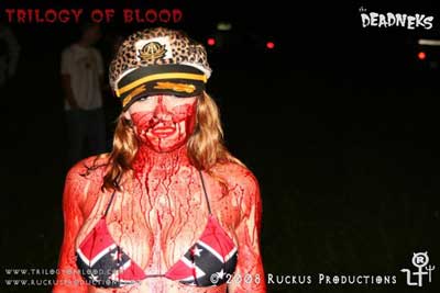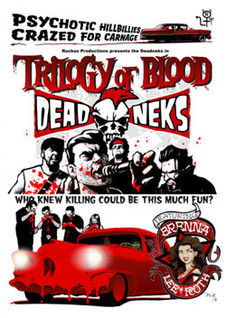 Starring Brenna Roth (B-movie starlet and daughter of legendary rocker David Lee Roth), and psychobilly sickos THE DEADNEKS – TRILOGY OF BLOOD is a carnage-crazed feast for the eyes and ears of hell-raisin’ Psycho Rock-and-Roll and 70’s exploitation-style cinematic madness!!! If you see only one triple-music-video-slash-southern-fried-horror-film this century – grab your vomit-bags and earplugs, and treat yourself to a…TRILOGY OF BLOOD!!!!!!!!