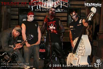 SEE the BLOOD! FEEL the TERROR! HEAR the PSYCHOBILLY SICKNESS!!!! Experience the sensory TRIPLE-SKULL-FUCK that is…TRILOGY OF BLOOD!!!!!!!! When a trio of sexy city gals picks up a broken-down hillbilly in the backwoods of Virginia – the three kittens get A LOT more than they bargained for when they accept the drifter’s invitation to a down-home barbecue. What these lovely ladies don’t know just may hurt ‘em – when they find that the menu of this hayseed hoe-down isn’t the standard ‘burgers and dogs’… Shot on-location by Ruckus Productions in the hills of Virginia with an estimated budget of roughly 62 dollars – TRILOGY OF BLOOD is a grindhouse gore-fest combining old-school drive-in horror, with three (count ‘em – THREE!!!) rowdy performances by the grittiest psychobilly act this side of Pleasant Valley!!!