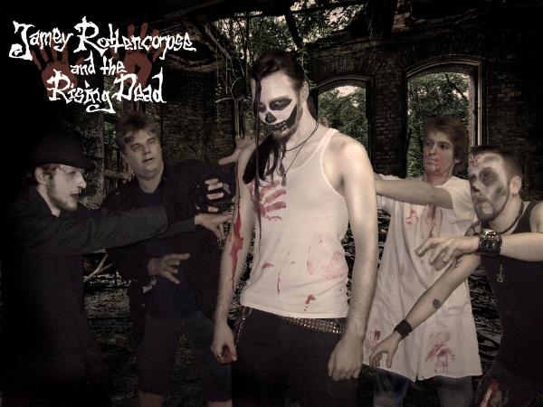 And now, I would like to introduce you to a talented horrorpunk band led by Andre’ Cox called Jamey Rottencorpse and The Rising Dead! The band hails from Bremen, Delaware and began in Halloween 2006. The band features Tom Tom Scumbag and Slimebag Die Well on gruesome guitars, Riot Earp on beastly bass, Dr. Herbert Boomstick on the dreadful drums, and sinful samples from Moldy Oddfingers. . great names! These guys pay homage to all the legends and represent everything I believe horrorpunk is lacking! Their first album will be released in a few months but you can check out their first video, The Rise Of The Dead, on their Myspace page now! Let’s get these ghoulies signed. . and support them as best as we can. . they deserve it!