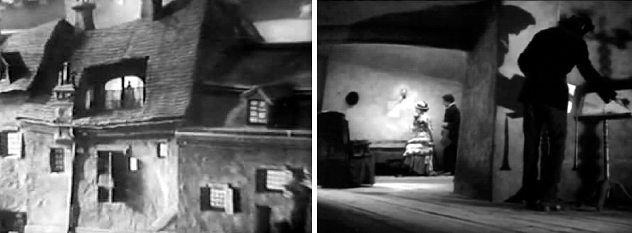 Unlike most films I present on The Schlocky Horror Picture Show, Svengali was made by a major studio, Warner Brothers, and they were able to give it the budget it deserved, as evidenced by the superb photography and the crazy expressionistic sets designed by Anton Grot. A native of Poland, Grot was originally a painter, but by the thirties was one of Warner Brothers most senior set designers, creating more than eighty films for that lucky studio by the time he retired in 1948. Svengali is one of his best. The cavernous rooms and corridors are both amazing and disconnecting. A number of these sets have ceilings, ten years before Orson Welles and Citizen Kane (1941) received credit for that innovation. Trilby standing by that huge door is an unforgettable image, like that large-scale model of Paris. A pinnacle of the model-makers art, it’s a pity we only get to see it once.