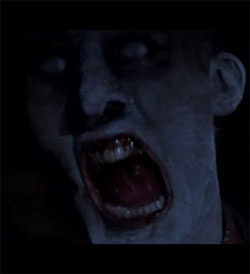 Evelyn finds Ben sitting on the couch with his arm moving – but that seems to be all. Ben’s severed head falls back with a satisfying squish, and we see Pin. Evelyn runs, but in true monster fashion, Pin can lumberingly catch up with her wherever she runs in the house. She is, of course, running upstairs to protect her baby. Pin catches her at the door, lifts her up by her neck, and presumably eats her. This is a very nice moment executed with minimal special effects that really are the what give this film it’s enjoyably creepy air. She is then gutted, and hung something like a marionette.