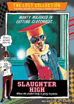 I remember when I was a young gore hound I would get excited whenever horror movie trailers came onto television. It was one of the only times I would ever sit still and be quiet and just watch, I grew up in a very open minded household so a lot of times I was allowed to go with my cousins to see these movies. One trailer though always stayed in my mind, honestly I don’t know why. The trailer was for the film Slaughter High, for years the image of the black and white picture of school nerd Marty smiling at the camera and then getting punched through by massive hands and arms always stayed with me. It wasn’t even until high school that I learned what the title of the movie was; I only had that image imprinted in my head.