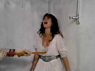 Slaughter High starts off by taking us back to those wonderful days of high school. School nerd Marty is being lead by 80’s bombshell Carol into the girl’s locker room for a bit of premarital sex (it wouldn’t be a slasher movie if we didn’t have it now would it?). Marty is stumbling all over himself but he assures her that he has had sex before, and he’s pretty good at it too. Carol tricks Marty into going into the shower while their other classmates make their way into the girls locker room armed with cameras and a javelin!??! High School can seem so brutal sometimes. While Carol sweet talks Marty he notices that someone has wrote “Marty Rantzen sucks!” on the wall. Marty quickly changes the S to an F therefore changing the message to say “Marty Rantzen Fucks!” that will teach em kiddo.
