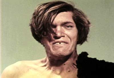 Now you know why Richard Kiel was entrusted with so few lines in the James Bond films. Listening to his dialogue delivery as Eegah I was irresistibly reminded of Sylvester Stallone’s big dramatic scene near the end of First Blood (1982) – nearly impossible to understand a word he’s saying. Though, with Mister Stallone that may be a blessing in disguise. The dialogue in some of his films is so abysmal that when you do understand what he’s saying, you wish you didn’t – but I digress again. In the same year as Eegah, Richard Kiel violated good taste again by playing an untrustworthy alien determined to eat ‘long pig’ in the above-average fondly-remembered Twilight Zone episode To Serve Man. A few years later Richard played the title character of The Monkees episode I Was A Teenage Monster, and as the swinging android he has several good lines. When the experiment goes wrong, there are some very funny moments when first he talks like a hippy, then like an effeminate interior decorator – it’s probably the artistic high-point of his acting career. In 1992 an injury in a car crash permanently affected his sense of balance, and since nobody is prepared to stand within 2.2 meters of the unsteady giant, he has all but retired.