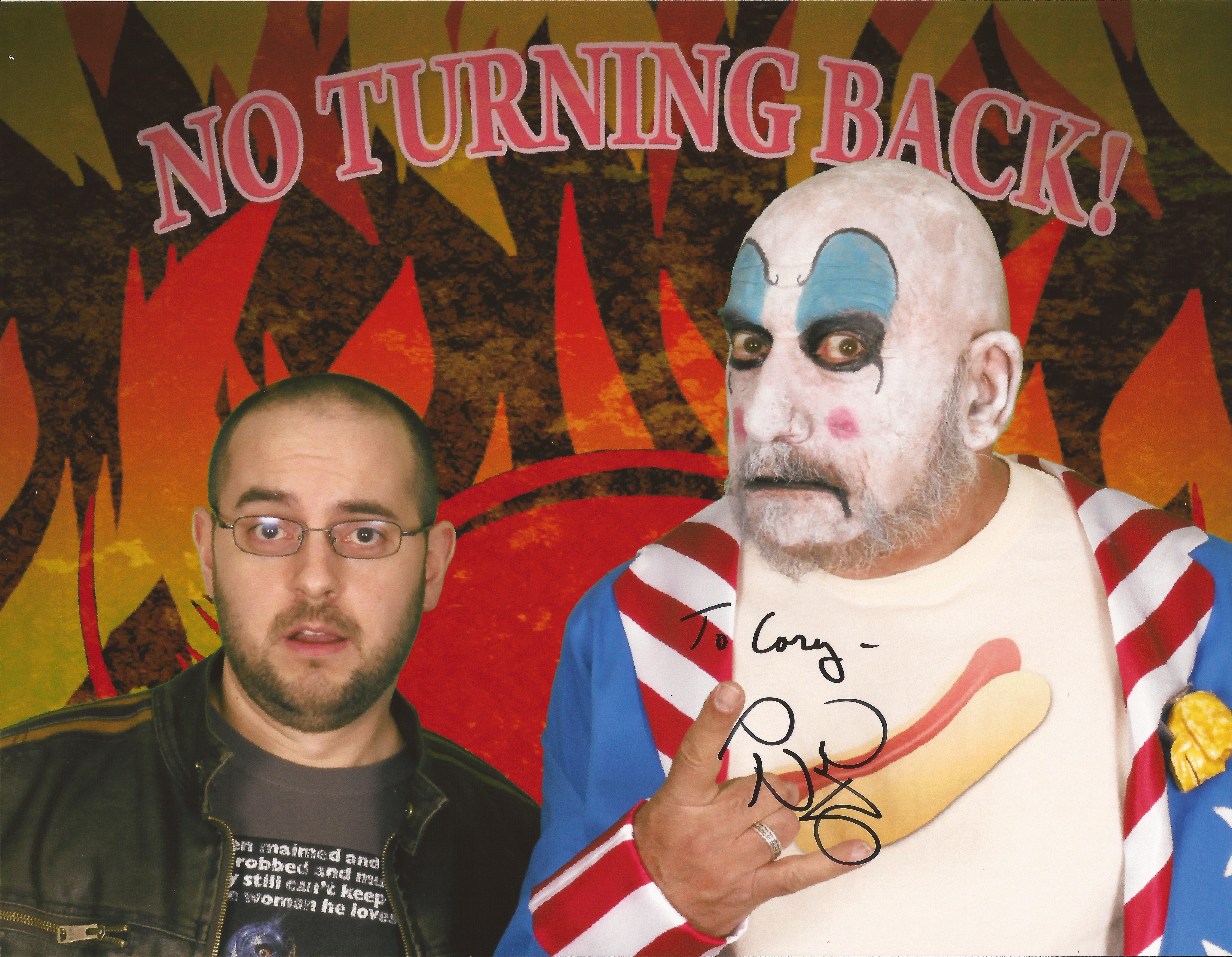 I attended a panel for “Halloween III: Season of the Witch” that featured director Tommy Lee Wallace, mask maker Don Post, the assassin (and former Michael Myers) Dick Warlock, as well as the films stars Stacey Nelkin and the legend that is Tom Atkins. This was fun to watch since most of the discussion were just stories of how they enjoyed working on the film. Wallace telling a story of how he and DP Dean Cundy were almost killed by Warlock when a car stunt went wrong, Atkins remembering the wrap party and drinking too much and smoking (not cigarettes) too much and crawling back to his room. There was good stuff here. Saturday afternoon was also host to a special photo-op with Mr. Sid Haig, dressed as Captain Spaulding. Yes, I partook and the picture turned out pretty funny.