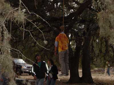 Hallettsville looks like a film that was made in a hurry, with no consideration for making the characters seem interesting or fleshing out a potentially good story line. In the films introduction, we are greeted to a series of jumbled 1901 flashbacks of school children being murdered, hanged and then buried. The flashbacks are revealed to be the nightmare of college kid, Tyler Jensen (Derek Lee Nixon). In the next scene we see Tyler at his Grandmother’s funeral. Outside of the church, he meets up with some of his lifelong friends, Luke (Logan Patrick Brown), who has apparently befriended the ghost that haunts his house, Mark (Jordan Brower), Adam (Aidan Marus), and Jonathan (Jesse Janzen), a neurotic nerd who enjoys telling dead baby jokes (What’s funnier than a dead baby? A dead baby in a clown suit!)