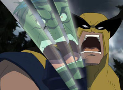 Next up “Hulk VS Wolverine”. You know when those 2 go at it its gonna be a party of pain. Ands party of pain is exactly what you get. Wolverine is called in by the military due to the Hulk rampaging a local village. Of course the fearless Wolverine takes the job and hunts him down. As expected, an all out battle ensues and alot of facing crushing blows are exchanged. Like the Thor tale, Hulk gets Wolverine down on the ground and pounds his face into pulp. A pretty common occurrence into these 2 movies. This only pisses off the regenerating Wolverine more who attacks with his admantium claws. The advantage here is that Wolverine can cut into the Hulk and cause pain. Now how do you know this is now a kid -intended film? Well for one there’s plenty of blood scenes, dismembering, and even a rip aapart by the arms scene, pretty intense! In comes the team known as Weapon X. Yep they are the bad guys in case your taking notes. Weapon x is Omega Red, Deadpool, Sabre Tooth, and Death strike.