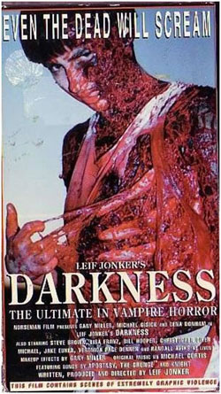 Darkness as a title is usually followed by several different words and the reason for this is because it has been edited and attempted to be cleaned up for years since its release. The rumor is that the film was originally supposed to be something of a “demo tape” of FX work and originally it was shot while being shown on a white piece of cardboard, yes the film is that low budget. The version I want to talk about here though is known as “Darkness: The Vampire Version”, this version has been tweaked to perfection.